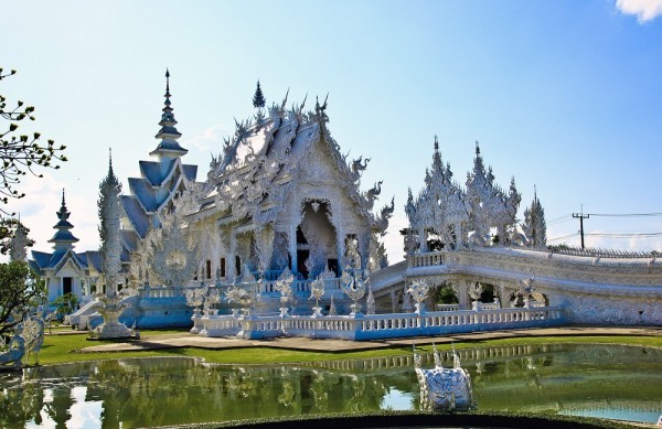 1. Wat Rong Khun, Thái Lan: Đây là một ngôi chùa thờ Phật có thiết kế kết hợp giữa kiến trúc truyền thống của Thái và nghệ thuật đương đại. Toàn bộ chùa được sơn trắng, màu trượng trưng cho sự thoát tục. Gần như mọi chi tiết trang trí đều màu trắng, điểm xuyết các chi tiết mạ vàng trong những bứ tranh mô tả quá trình thoát khỏi bóng tối của cám dỗ để tới Niết Bàn. Ngôi chùa còn được lắp nhiều tấm kính phản chiếu, tượng trưng cho trí tuệ vô hạn của Đức Phật làm cả vũ trụ bừng sáng. Ảnh: Therichest.com