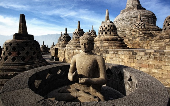 8. Đền Borobudur, Indonesia: Ngôi đền nằm ở Trung Java này được xây dựng theo hình hoa sen có thể nổi trên một hồ nước lớn. Đền đã bị bỏ hoang 1.000 năm trước và bị bao phủ bởi tro bụi sau vụ phun trào của núi lửa Merapi. Năm 1814, đền Borobudur lại được tìm thấy và trở thành di sản thế giới do UNESCO công nhận. Trong đền có một chiếc chuông cỡ lớn được các tín đồ gọi là “Sen Thiêng”. Ngôi đền có 504 tượng Phật và được coi là ngôi đền Phật giáo lớn nhất, cổ nhất thế giới. Ảnh: 2015travelling.com