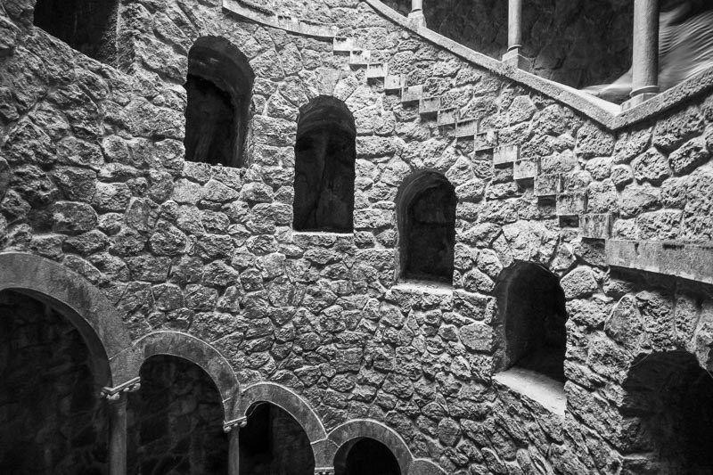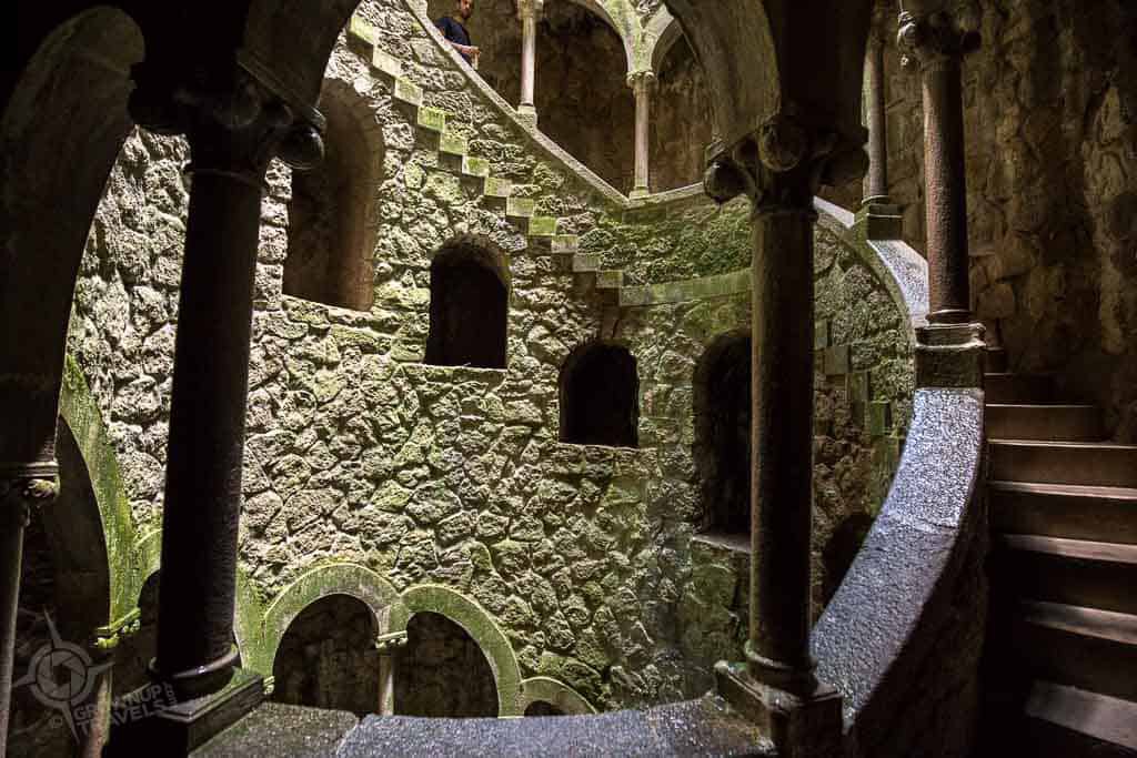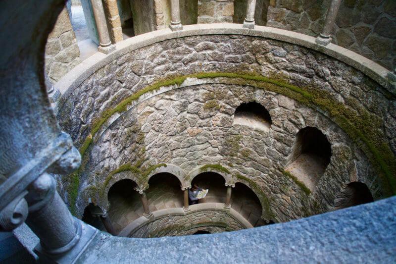 Giếng được gọi với cái tên Khai tâm, là nơi diễn ra các nghi lễ sơ khai của hội Tam Điểm. Đáy giếng có một chiếc la bàn đặt trên cây thánh giá hình chữ thập tượng trưng cho cho sự sống và cái chết của hội Tam điểm ở trung tâm. Khu vực xung quanh lâu đài có các hồ nước, hang động, ghế đá, đài phun nước, hệ thống đường hầm nối liền với 2 giếng xoắn ốc. Ảnh: Julie Dawn Fox in Portugal.