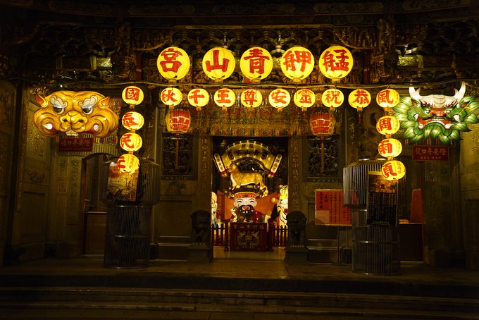 Một ngôi miếu ở Ximending vào ban đêm, mở cửa và thắp đèn cả đêm để người dân đến viếng vào dịp đầu năm.