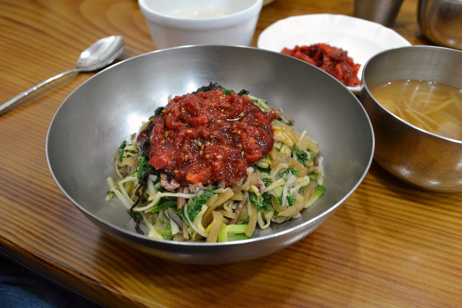 Yukhoe bibimbap, Jinju: Thành phố Jinju ở tây nam Busan có một biến thể món bibimbap rất nổi tiếng, đó là Yukhoe. Khác với bibimbap truyền thống, món ăn này có thành phần gồm gạo hấp, thạch đậu xanh, yukhoe, rong biển khô, với những miếng thịt bò sống julienned đặt phía trên.