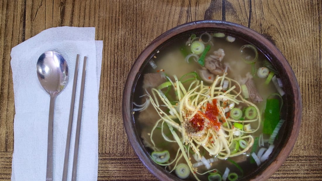 Gomtang, Naju: Khi đến thị trấn nhỏ Naju ở đông nam Hàn Quốc, bạn hãy nếm thử món súp thịt bò hầm (gomtang) tại nhà hàng White House, một nhà hàng lâu đời bên trong thị trấn. Món ăn này được phục vụ cùng cơm, bên trong có hành lá, thịt bò, và những miếng trứng mỏng như sợi mì.
