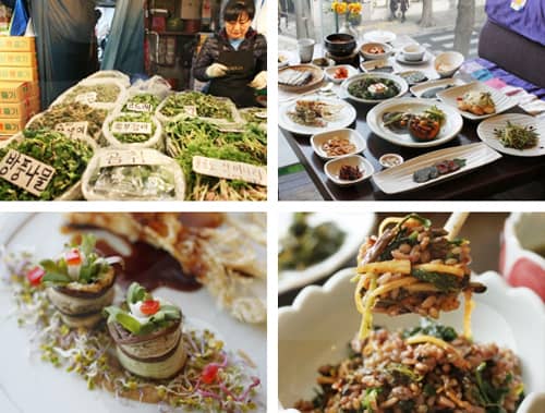 Khí hậu bắt đầu ấm lên vào mùa xuân, cây cỏ khắp Hàn Quốc bắt đầu đâm chồi nảy lộc. Có nhiều loại rau mùa xuân khác nhau tại Hàn Quốc như ssuk (ngải cứu), gondeurae, gosari (dương xỉ), dalle (hành dại), và naengi (rau tề). Mùa xuân tới cùng những loại rau xanh bổ dưỡng này giúp cân bằng các bữa ăn.