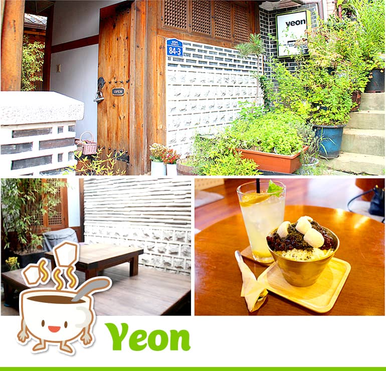 Yeon là một quán cà phê hanok nổi tiếng ở phường Samcheong. Quán nàynằm trong một tòa nhà hanok nơiđược giữnguyên cấu trúc ban đầu thông qua cải tạo. Trong căn phòng lớn, có một bản đồ thế giới trên tường. Bạn cũng sẽ tìm thấy sách hướng dẫn du lịch ở khắp quán. Yeon phục vụ nhiều loại trà truyền thống Hàn Quốc và đồ ăn nhẹ, nhưng bạn cũng có thể gọi cà phê, chè chai Ấn Độ và lassi, và bánh kếp chuối Thái, sẽ mang đến cho bạn cảm giác của các vùng miền quốc tế. Cũng trên menu là các loại cocktail, bia, các loại đồ uống có cồn, và món khai vị. Tại Yeon, bạn sẽ không chỉ trải nghiệm sự thanh lịch của truyền thống Hàn Quốc mà còn có sự thanh lịch của món ăn dân tộc của thế giới.