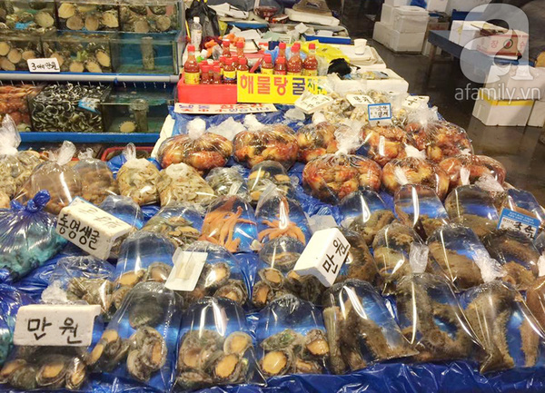 Không chỉ có cá, chợ này còn có đủ bào ngư hải sâm, cá chình cá đuối, bạch tuộc cua chân dài với mức giá rẻ đến... phát choáng, nhất là các loại cá sấy khô để nhâm nhi với bia!