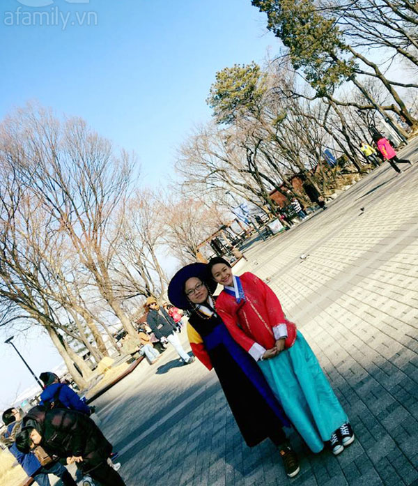May mắn cho bọn mình là hôm đó Namsan đang có chương trình trao đổi văn hoá, bọn mình được mặc thử Hanbok - Trang phục truyền thống của Hàn Quốc chụp ảnh làm kỉ niệm, đỡ phải tốn tiền thuê ở tiệm