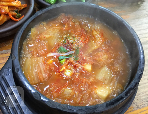Canh kim chi hầm thịt ăn kèm các loại kim chi và ớt sừng chấm tương hột