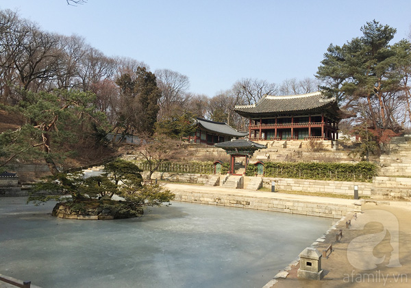 Sau khi tham quan Changdeokgung xong, bọn mình đi qua cổng Secret Garden để theo đoàn đi khám phá khu vườn Huwon. Huwon bắt buộc khách phải đi theo hướng dẫn, cách 30 phút sẽ có một tour, vào một cửa ra một cửa mất khoảng, tour mất khoảng 90 phút. Trời mùa đông lạnh buốt, hai bên đường lá rụng và mặt hồ đóng băng, nhưng nơi đây vẫn rất đẹp. Nếu đi vào mùa thu chắc sẽ còn đẹp lẫy lừng hơn nữa.