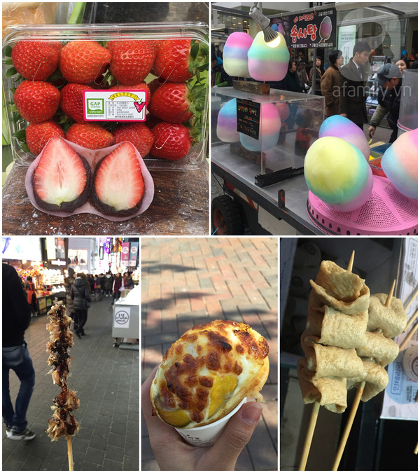 Không chỉ thế ở khu này còn có các món ăn rất đặc sắc, như bánh Mochi dâu, chả cá Oden, kẹo bông gòn, bạch tuộc nướng... với giá khá dễ chấp nhận. Mải đi chơi, ngắm đồ, mua sắm nên mình ăn trưa ở khu Myeongdong luôn, vì ở khu đó đồ ăn đa dạng và giá cả phải chăng.