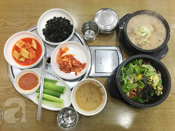 Bữa trưa gồm có Bibimbap, Miến Bulgogi, Canh kim chi tổng cộng hết 12.000won/ 2 người