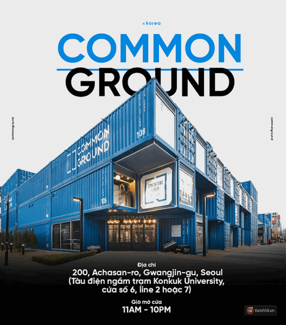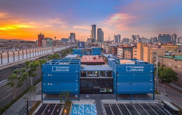 Nằm ở gần trường Đại học Konkuk, Commond Ground nổi bần bật với một màu xanh dương mát mắt được dựng lên bởi 200 khối container khổng lồ. Chỉ nhìn thôi đã thấy đẹp, mà đã đẹp là phải ghé vào xem thử, đây chắc chắn là cảm giác của bất kì ai khi nhìn thấy Common Ground từ đằng xa.