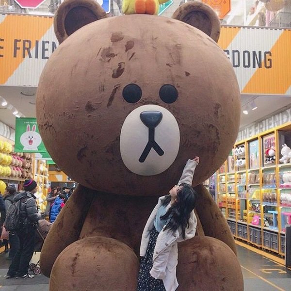 6. Nếu đã đến Myeong Dong rồi thì đừng quên chụp ảnh với chú gấu tại Flagship Line Friend Myeong Dong, hoặc bất kì store nào của Line để “điểm danh” mình đã ở Hàn Quốc nhé.