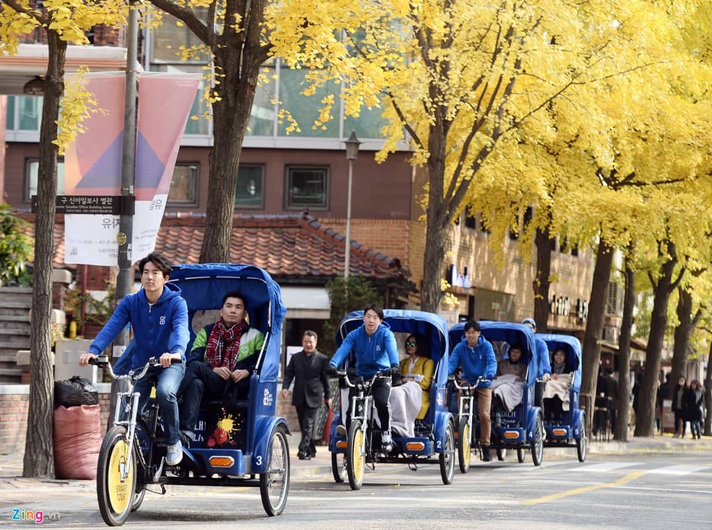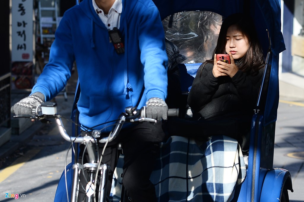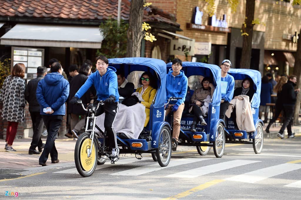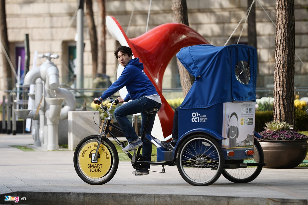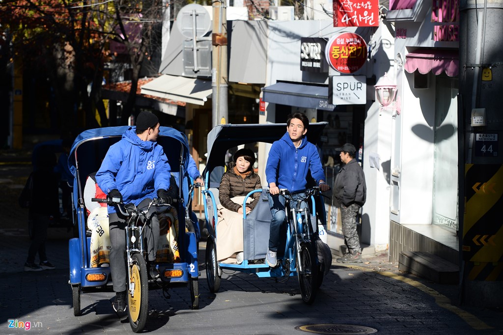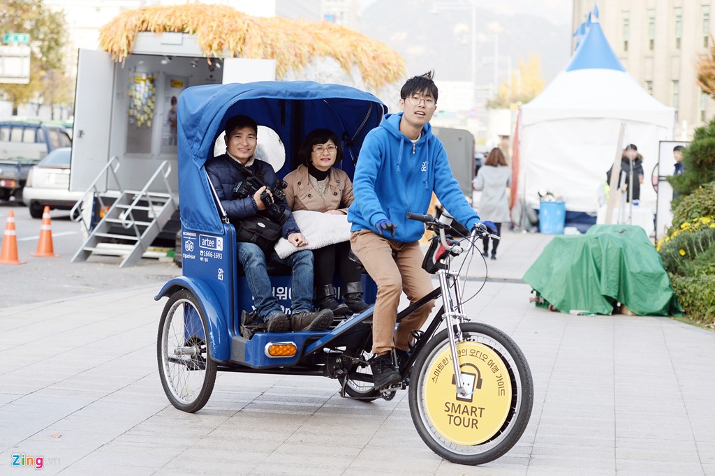 Trên đường phố Seoul thường xuất hiện một nhóm thanh niên đạp xích lô có mui chở du khách tham quan. Đây là một dịch vụ ít người biết, nhưng xuất hiện ở xứ Hàn đã 4 năm.