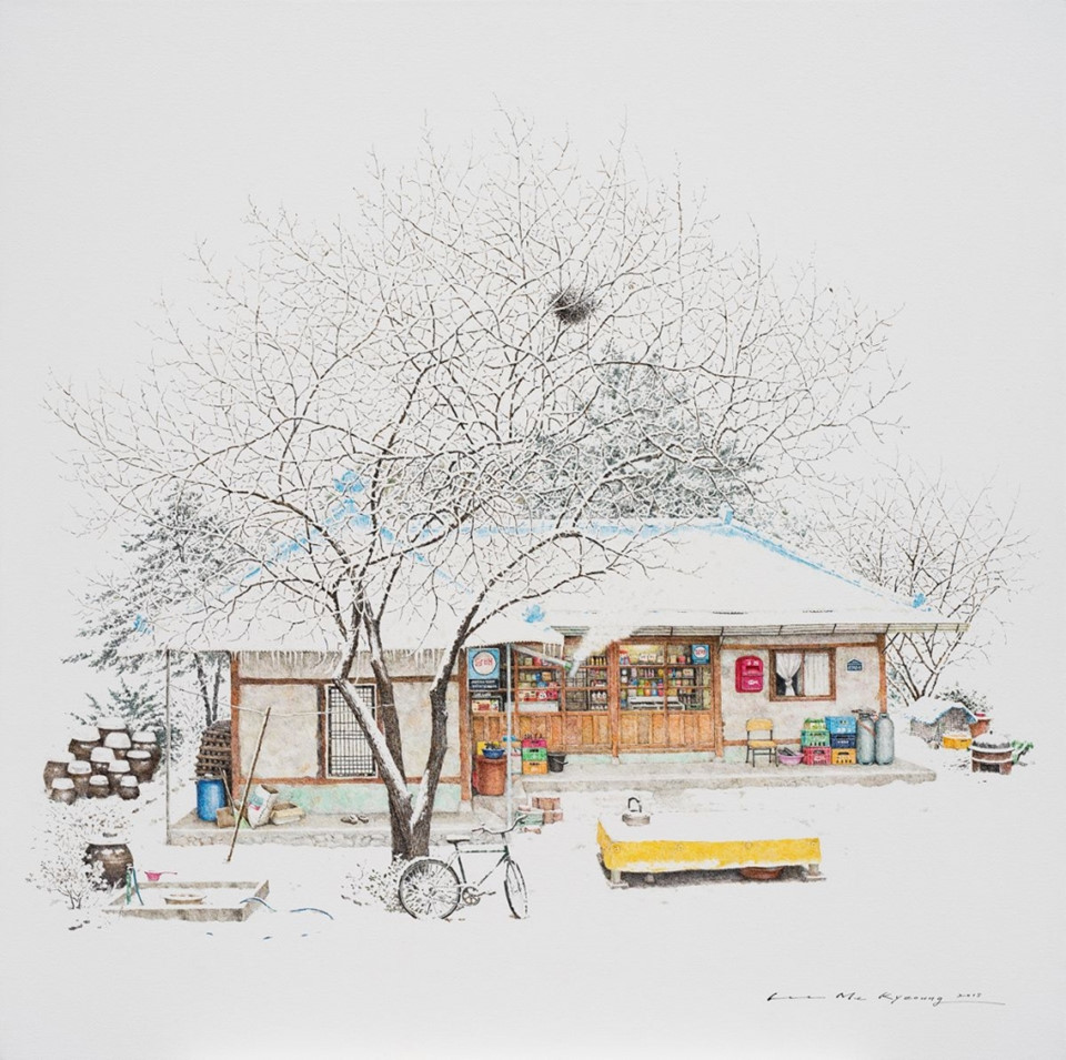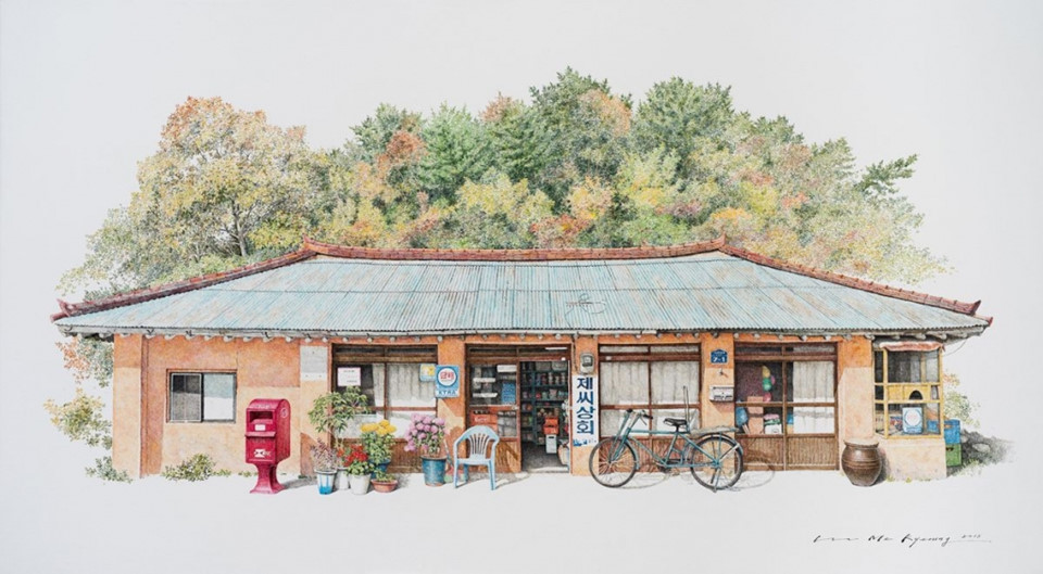 Cửa hàng tạp hóa giản dị bên trong những ngôi nhà gỗ cũ kỹ, hình ảnh gợi nhớ về đất nước Hàn Quốc thập niên 70, 80 là nguồn cảm hứng sáng tác những bức vẽ màu nước duyên dáng của nữ họa sĩ Me Kyeoung Lee.