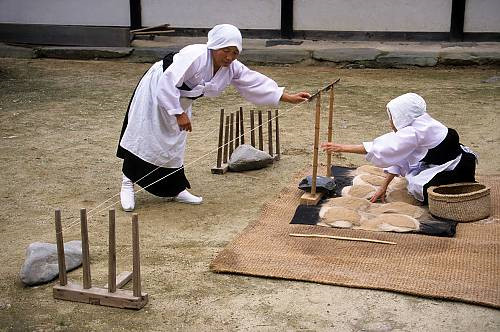 Những phụ nữ trung niên đang dệt tầm gai ở khu vực Hansan