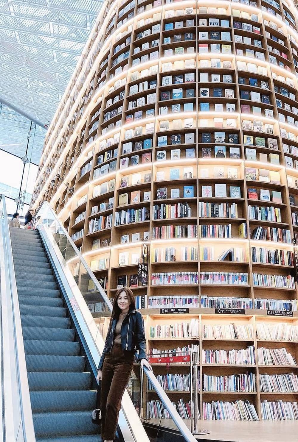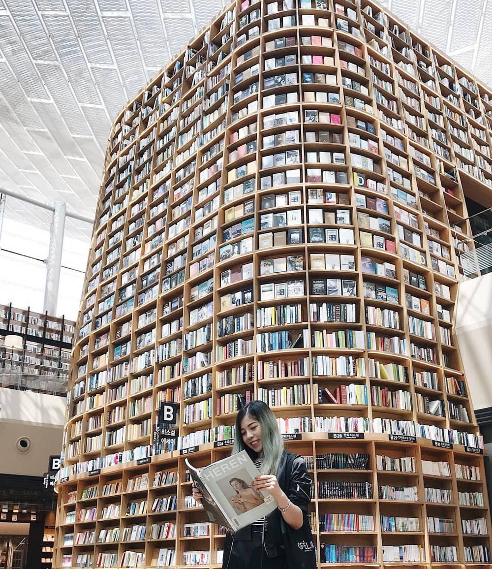 Giới trẻ cũng bắt kịp xu hướng khi check-in cực sành điệu trong khuôn viên thư viện Starfield. Giá sách của thư viện được thiết kế cao bằng chiều cao của một tầng trung tâm thương mại.