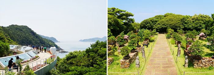 Ảnh: Đường mòn đi bộ tại Vườn Thực vật (trái)/ Vườn cây cảnh tại Jangsado (phải)