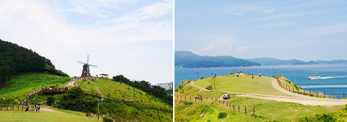 Đồi gió là một nơi mà du khách bắt buộc phải đến thăm quan khi đến Geoje. Nằm phía bên phải Bến Dojangpo, là bến có phà đến đảo Oedo, ngọn đồi có cảnh quan tuyệt đẹp nhìn thẳng ra cánh đồng cỏ xanh biếc, trải dài đẹp như trong tranh. Khi leo lên đồi, làn gió tươi mát sẽ “đánh bay” hơi nóng bao phủ toàn bờ vịnh. Ngay khi lên đến đỉnh đồi, cảnh biển tuyệt đẹp trải ra trước từng bước chân như chào đón du khách.