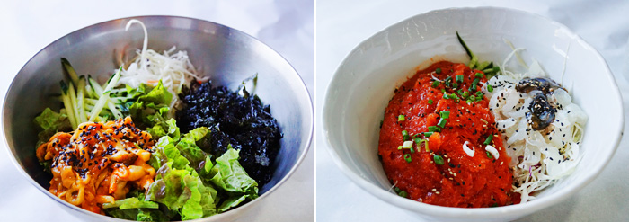 Ảnh: Cơm trộn bibimbap hải tiêu (trái) / Canh gỏi cá lạnh (phải)