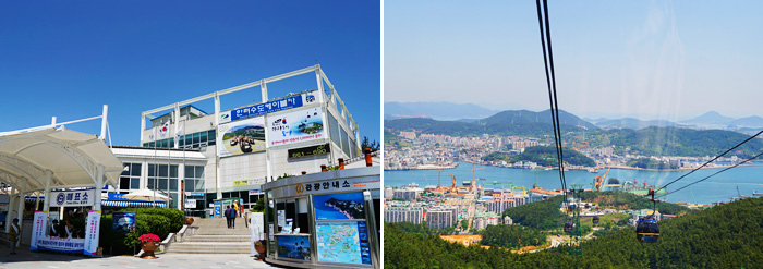 Ảnh: Ga khởi hành cáp treo Hallyeosudo (trái) / Quang cảnh Trung tâm Thành phố Tongyeong chụp từ cáp treo (phải)