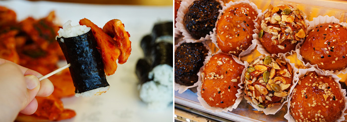 Ảnh: Kim-báp Chungmu (trái) / Bánh mật ong Tongyeong (phải)