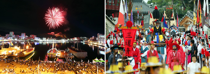Ảnh: Pháo hoa tại lễ khai mạc Lễ hội Đại chiến Hansan (trái)/ Tái hiện cuộc diễu hành của Đại chiến Hansan (phải) (Ảnh lưu tại Hiệp hội Tưởng niệm Hansan Daecheon)