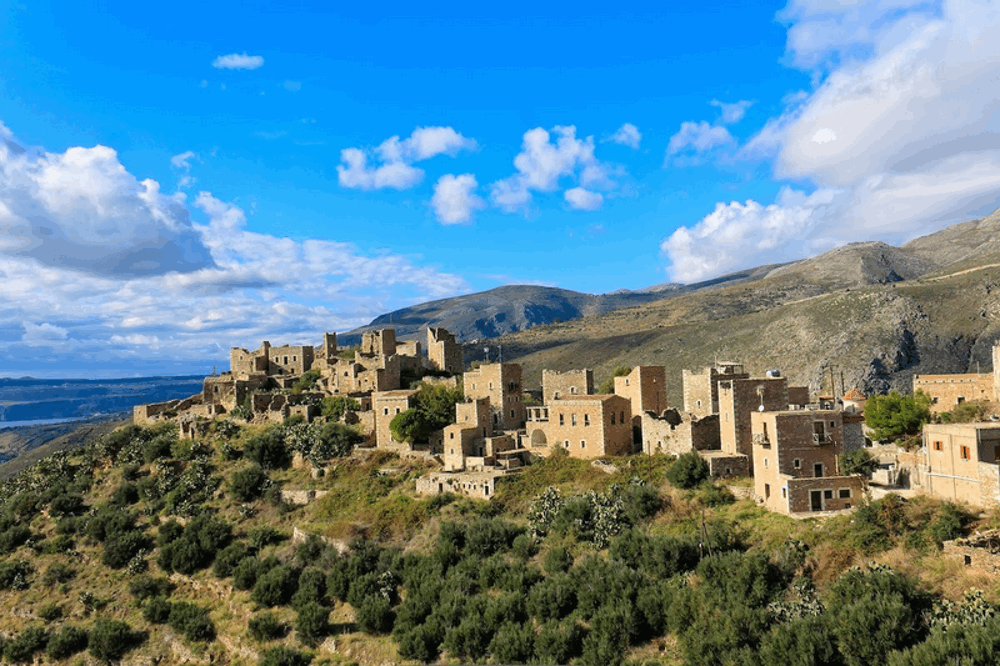 Những ngôi nhà bằng đá nhấp nhô trên vùng đồi núi tại Mani thuộc vùng Peloponnese.