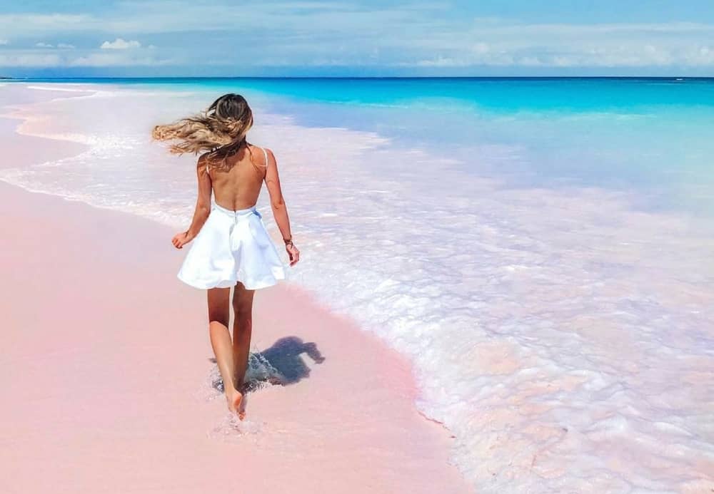 Bãi cát trải dài thoai thoải có màu hồng phơn phớt nhẹ và sẽ thay đổi sắc độ theo ánh nắng mặt trời. Khi nhìn từ trên cao, du khách sẽ không tin nổi vào tuyệt tác đẹp đến độ siêu thực mà tạo hóa đã ban tặng.