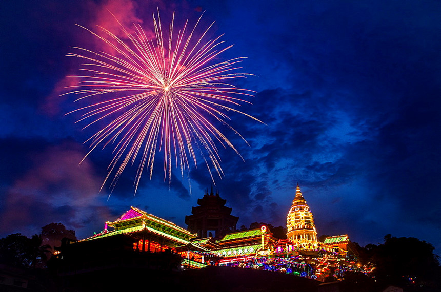 Pháo hoa trên bầu trời Penang, nơi có ngôi chùa Cực Lạc (Kek Lok Si Temple) với hơn 10.000 bức tượng Phật chạm khắc công phu, cũng lung linh không kém. Vào dịp Tết ở Malaysia, ngôi chùa còn được thắp sáng bởi hàng nghìn ngọn đèn rực rỡ.