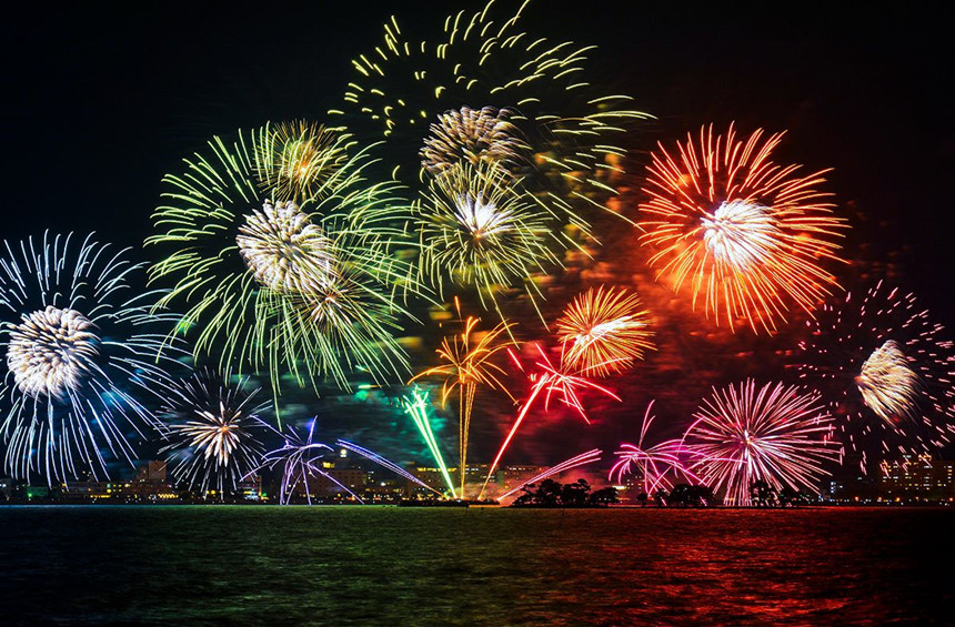 Bãi biển Johor Bahru, thành phố hiền lành, thanh bình tiếp giáp với Singapore, cũng có màn trình diễn những “đóa hoa ánh sáng” ấn tượng.
