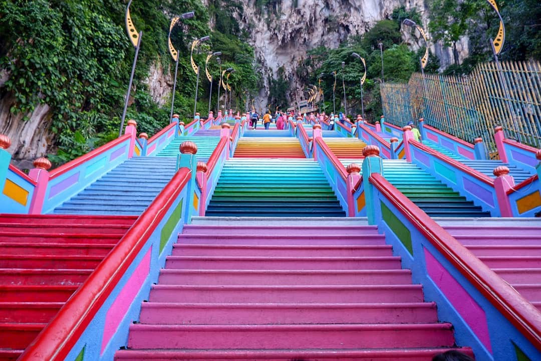 Để lên thăm động chính, nơi có đền thờ Ấn Độ giáo ở độ cao 100m, du khách sẽ phải vượt qua 272 bậc thang. Nếu như là trước kia, đây cũng có thể coi như một thử thách nho nhỏ cần thể lực thì hiện tại, bằng công cuộc thay màu áo cho cầu thang dài này, nơi đây bỗng chốc trở thành địa điểm hút các tín đồ chụp choẹt hơn cả, lý do đơn giản là vì nó quá đẹp, vậy thôi!