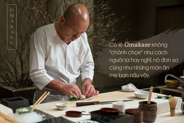 Hiểu theo một cách khác, có lẽ Omakase không "chảnh chọe" như cách người ta hay nghĩ, nó đơn sơ cũng như những món ăn mẹ bạn nấu vậy. Hàng ngày, đầu bếp Omakase cũng như mẹ bạn, tới chợ chọn ra cái gì tươi ngon nhất. Và mỗi ngày trở về nhà, không phải bạn luôn háo hức chờ xem mẹ nấu món ngon gì cho mình hay sao? Một điểm thú vị khác của Omakase là nó tạo nên mối tương tác rất đáng yêu giữa đầu bếp và thực khách. Khi gặp đầu bếp hợp rồi, bạn hoàn toàn có thể tin tưởng giao món ăn cho họ, giống như cách bạn đã làm với mẹ vậy.