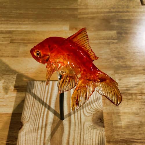 Kẹo mút nghệ thuật Amezaiku hình cá vàng tinh xảo được nghệ sĩ Shinri Tezuka làm bằng tay. Du khách có thể tìm mua những chiếc kẹo mạch nha trong suốt có hình dáng bắt mắt này tại cửa hàng kẹo Ameshin, Tokyo.