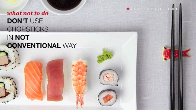 - Và khi ăn sushi thì điều đầu tiên bạn cần tránh là không dùng đũa chọc vào cuộn sushi. Bởi thói quen này có thể khiến sushi bị rách tung tóe và trông cũng thiếu lịch sự.