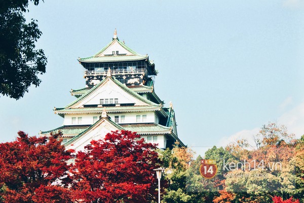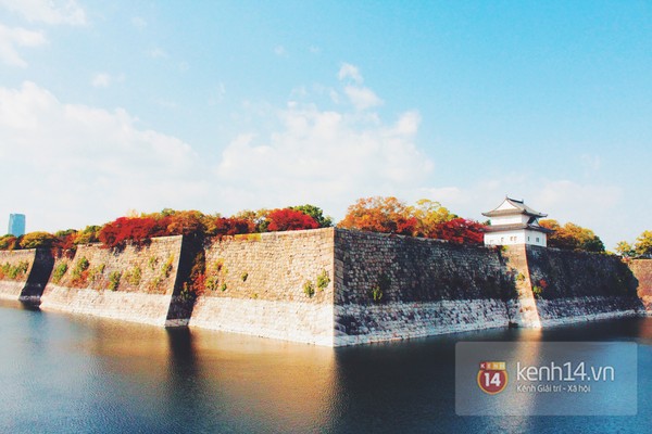 Lâu đài Osaka thì đẹp miễn chê nhé, tuy nhiên hôm ấy tớ không vào được vì bên trong đang bảo trì. Tòa lâu đài tọa lạc trên một mỏm đá to, xây dựng từ xa xưa với mục đích quốc phòng. Bao quanh tòa lâu đài là một ghềnh hào cực to với tường thành bao quanh đi bộ những 10 phút mới tới lâu đài.