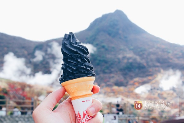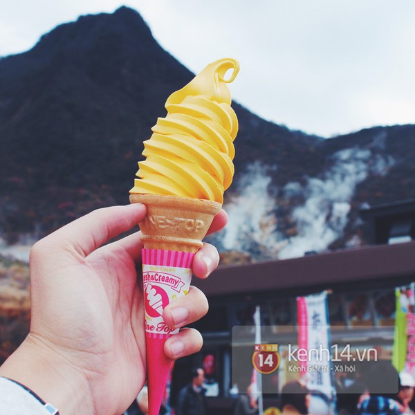 Owakudani là điểm đến thú vị nhất trong hành trình chinh phục món kem Hokkaido Nhật Bản. Vì ở đây tớ được thử 2 vị kem lạ lùng nhất trên đời. Đầu tiên là vị trứng, cực béo, lại cực kì xốp mịn, ăn vào là như vị … trứng. Màu của kem cũng màu như lòng đỏ trứng gà dòm yêu yêu. Kem ở đây 1 cone to vật luôn, ăn mà no.