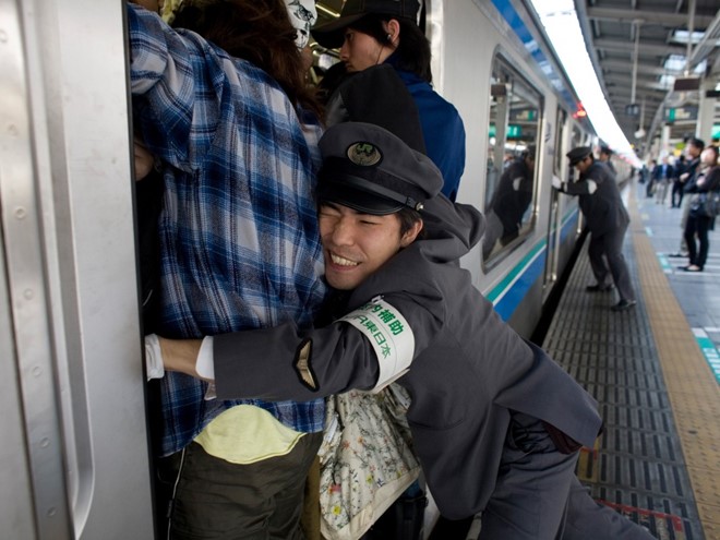 Tàu hỏa, tàu cao tốc ở Nhật Bản đặc biệt đông đúc vào buổi sáng và những giờ tan tầm. Các trạm dừng có một đội ngũ riêng, có nhiệm vụ đẩy, nhồi nhét hành khách vào các toa xe để tàu khởi hành đúng giờ.