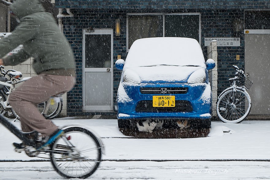 Những chú mèo trú tuyết dưới gầm một chiếc xe ôtô