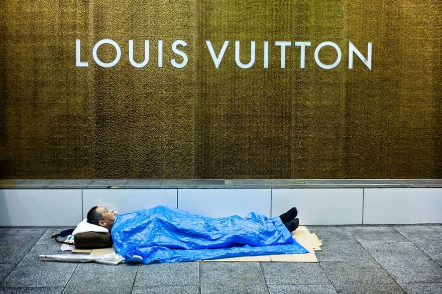 Bức ảnh người đàn ông nằm ngay ngắn dưới biển hiệu Louis Vuitton dấy lên tranh cãi liệu ông có phải là một người vô gia cư hay không.