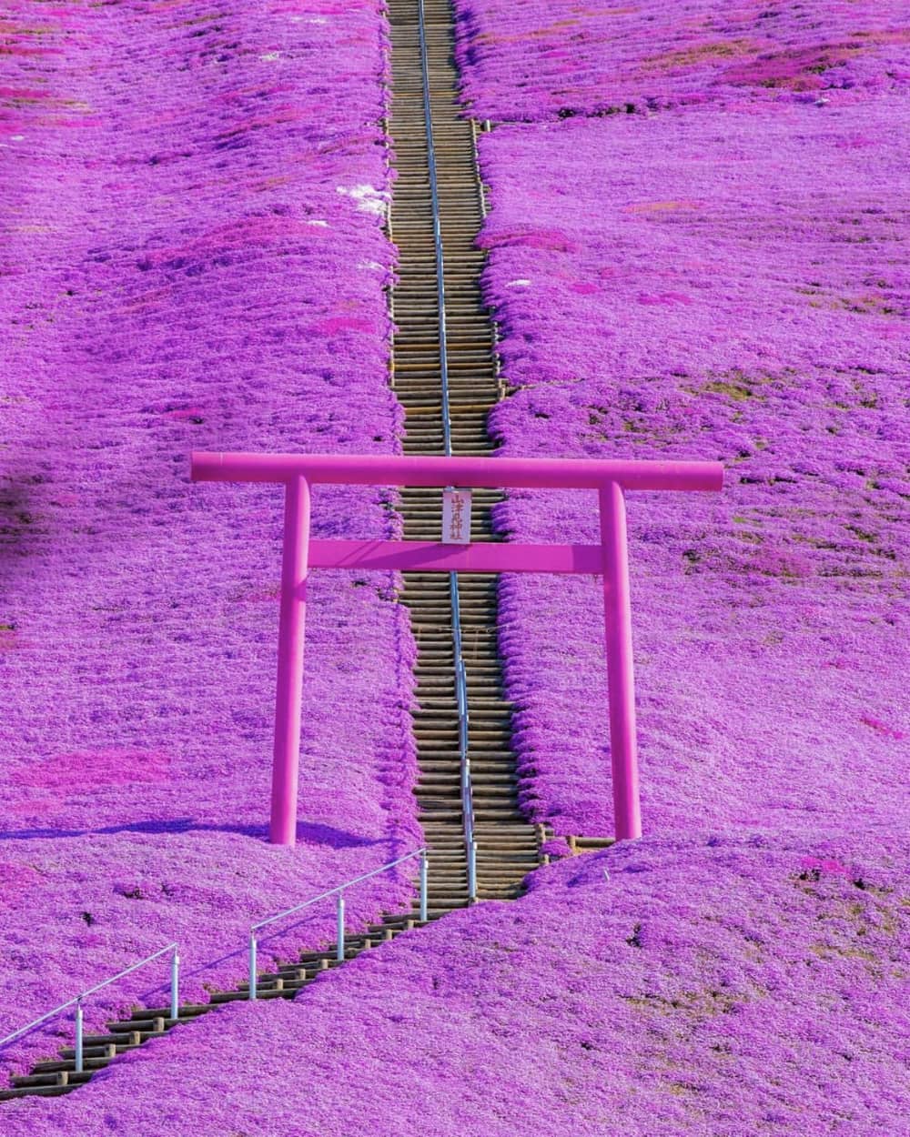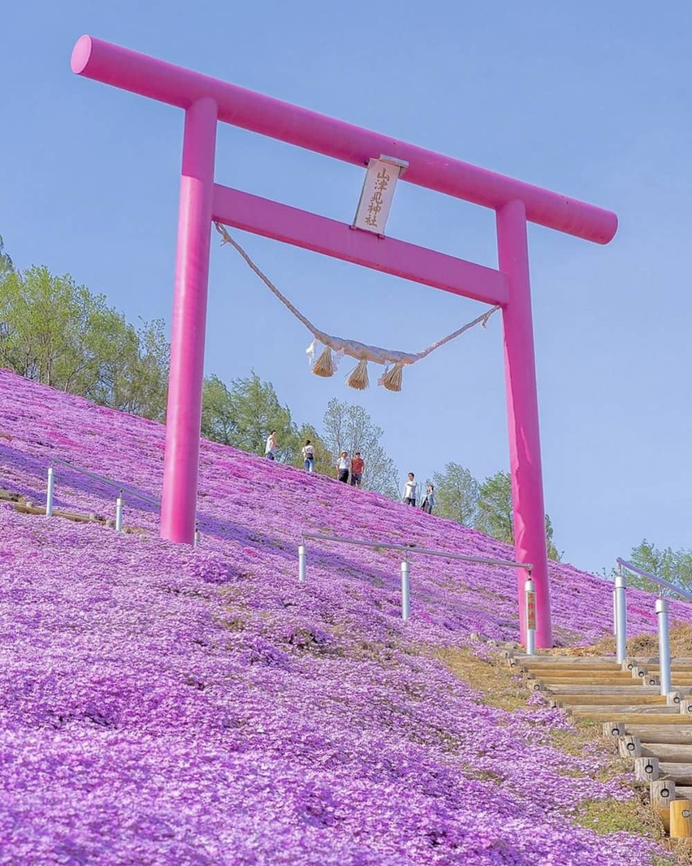 Torii màu hồng ở công viên hoa Chi Anh Shibazakura Higashimokoto, Hokkaido