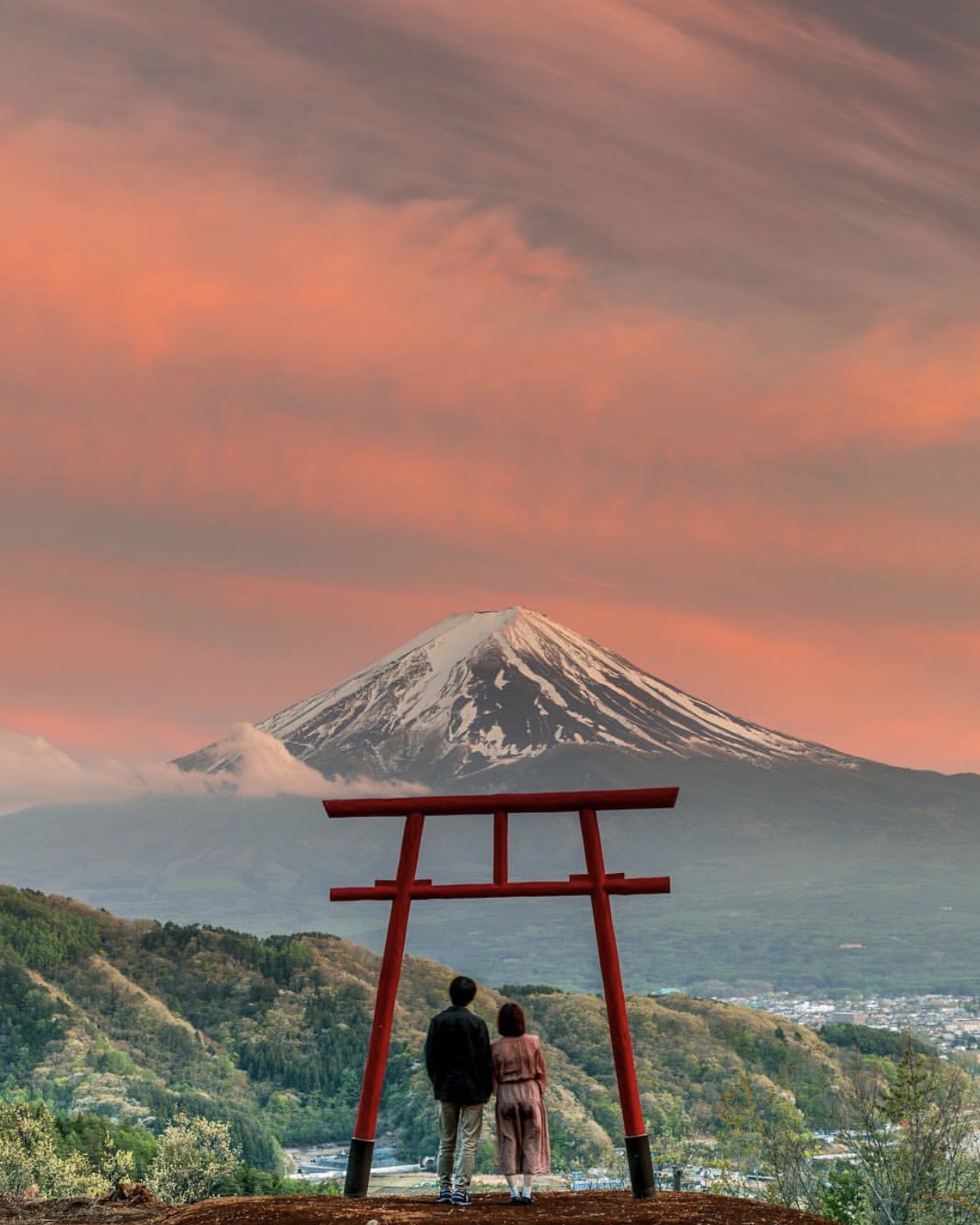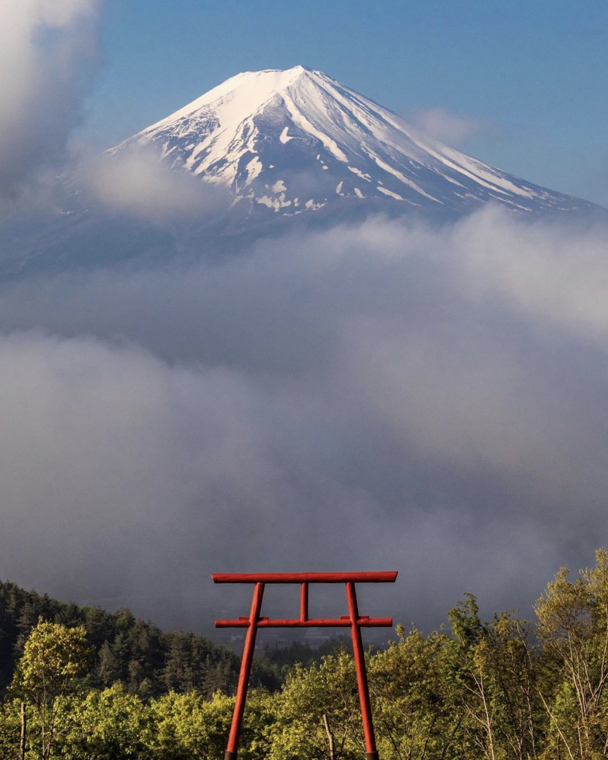 Torii nhìn lên núi Phú Sĩ ở Yamanashi