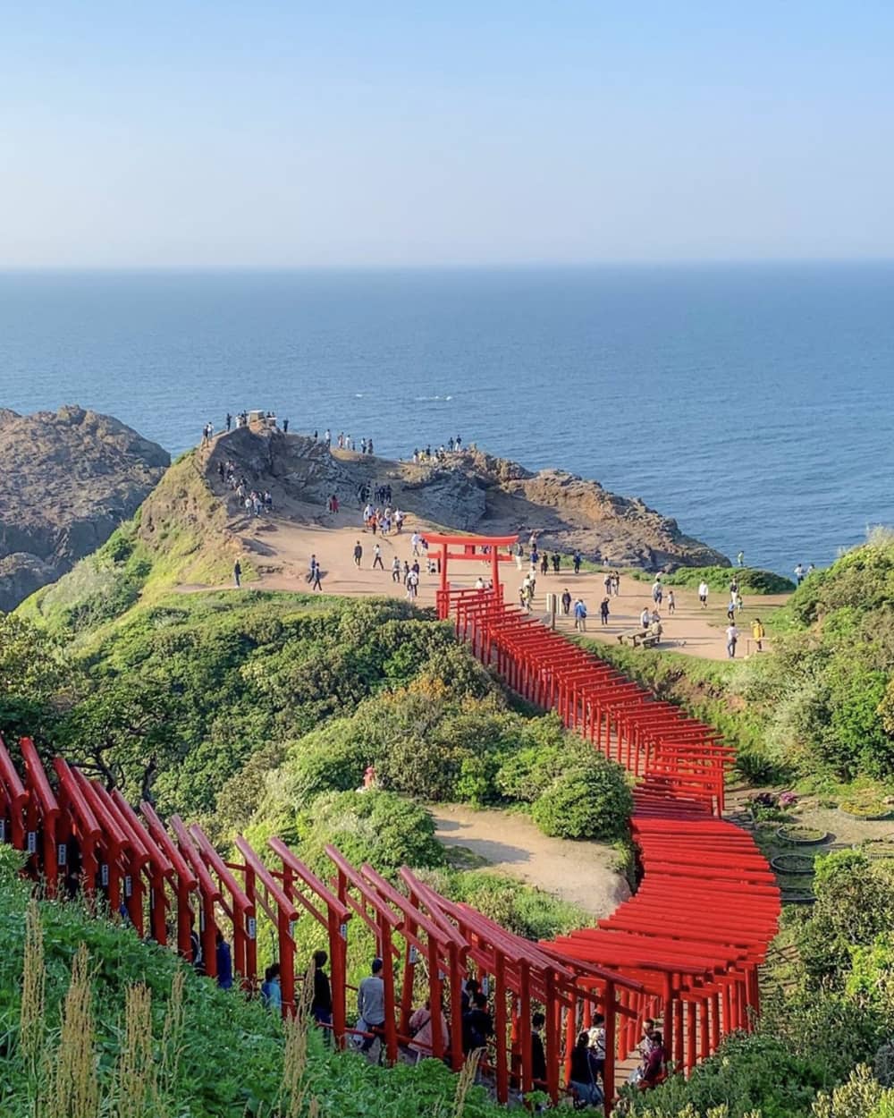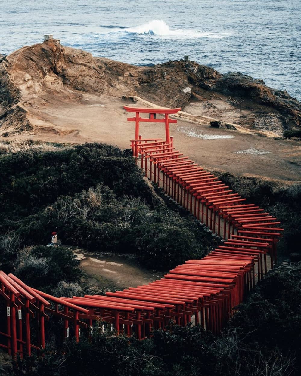 Nổi tiếng không kém đền nghìn cổng Fushimi Inari ở Kyoto, đền Motonosumi Inari với 123 cánh cổng là một địa điểm được rất nhiều du khách yêu thích và mong được một lần được khám phá. Hơn 100 cổng Torii đỏ rực rỡ nằm bên bờ biển xanh biếc tạo nên khung cảnh tuyệt đẹp phải không nào!?