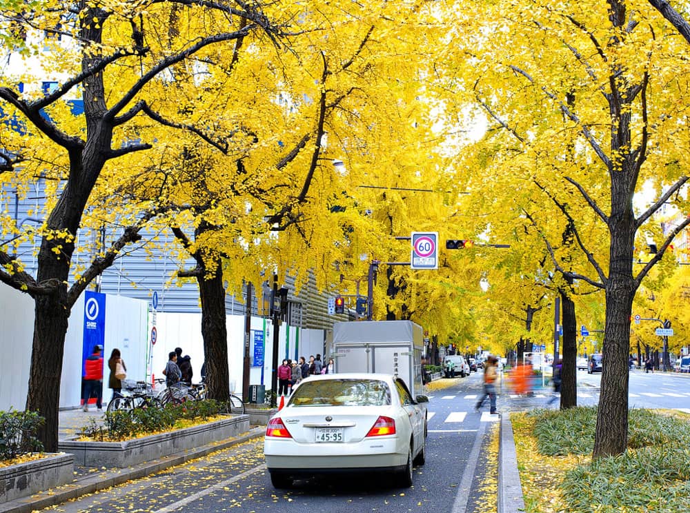Khi đến Osaka, bên cạnh chiêm ngưỡng màu đỏ rực rỡ của lá phong thì 1 trong 4 địa điểm ngắm mùa thu tuyệt đẹp ở Osaka mà bạn không thể bỏ qua đó chính là đại lộ Midosuji với những cây bạch quả màu vàng ươm cũng là một khung cảnh tuyệt vời cho một tính đồ yêu thích sự lãng mạn và đam mê sống ảo.