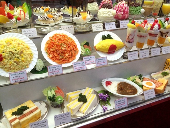 Hầu hết nhà hàng ở Nhật Bản đều trưng bày những đĩa thức ăn mẫu bằng nhựa, tượng trưng cho các món trong menu. Điều này giúp bạn dễ chọn món, đồng thời hình dung được món ăn thực tế trông thế nào. Ảnh: Sugoroku.osaka.