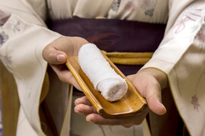 Trước khi ăn, các nhân viên phục vụ sẽ đặt trên bàn một chiếc khăn ướt (oshibori). Sẽ lịch sự hơn nếu bạn lau tay ngay khi chúng được mang ra, nhưng nên nhớ loại khăn này không được dùng để lau mặt hay cổ. Ảnh: Hatsuhanatei.