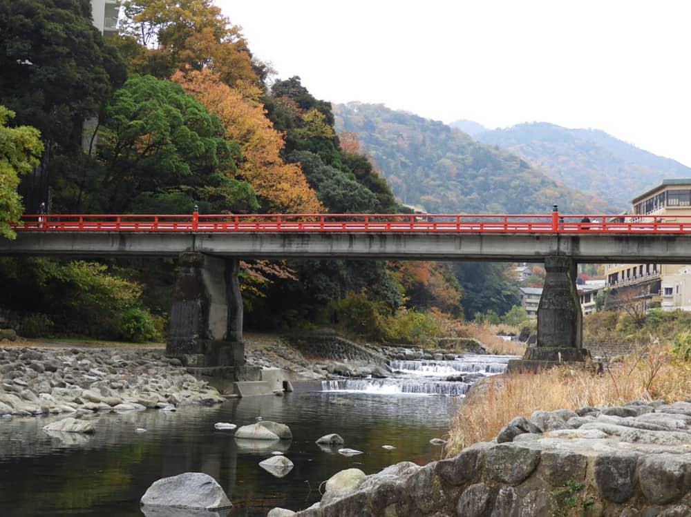 Cảnh dòng sông êm đềm dưới chân cầu Ajisai Bashi vào mùa thu.