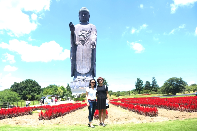 Ushiku Daibutsu - Tượng Phật bằng đồng cao nhất thế giới. Dưới chân tượng là những luống hoa đầy màu sắc.