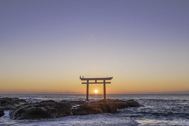 Mặt trời mọc trước cổng Đền Oarai Isosaki-jinja
