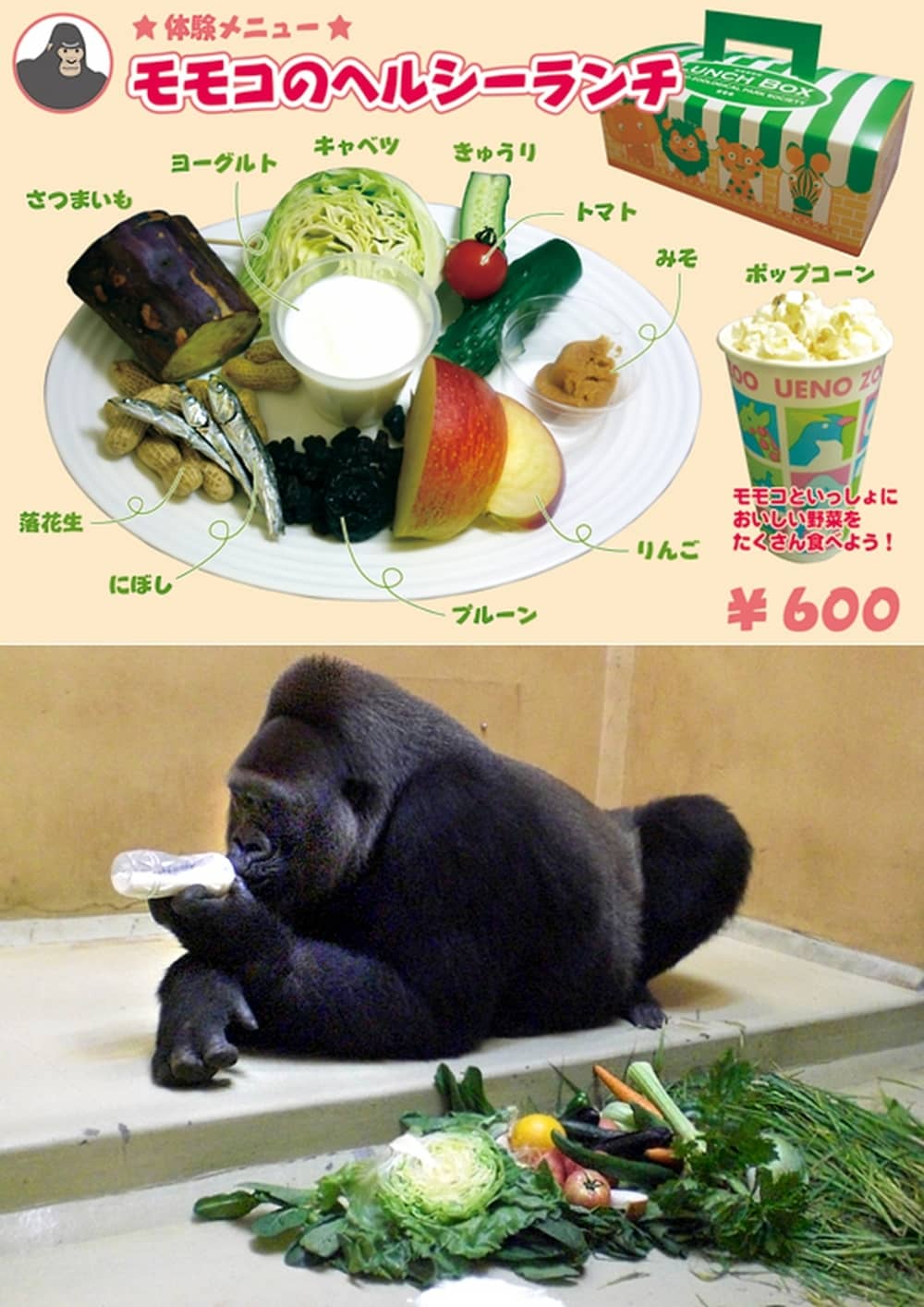 Du khách có thể thưởng thức “Bữa trưa lành mạnh cùng Momoko”, bao gồm trái cây tươi, các loại hạt, rau quả và các loại đậu, các món ăn thườn được phục vụ cho những chú khỉ đột vùng đồng cỏ sống tại vườn thú,.