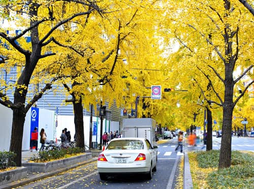 Ngoài những rừng phong khoe sắc đỏ thì những cây bạch quả màu vàng ươm cũng là nét đẹp đặc biệt của Osaka khi đất trời vào thu. Đại lộ Midosuji là điểm đến mà bạn nên đánh dấu, dài 4 km và chiều rộng 44 m, chạy dài từ Bắc tới Nam, nối liền hai trung tâm giải trí lớn của Osaka là Umeda và Namba.
